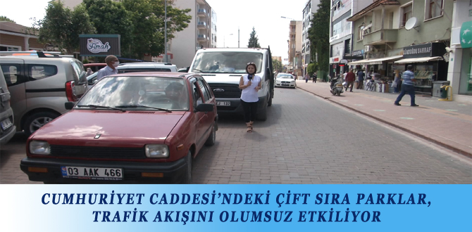 CUMHURİYET CADDESİ’NDEKİ ÇİFT SIRA PARKLAR, TRAFİK AKIŞINI OLUMSUZ ETKİLİYOR