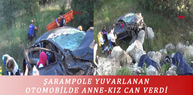 ŞARAMPOLE YUVARLANAN OTOMOBİLDE ANNE-KIZ CAN VERDİ
