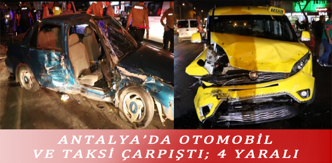 Antalya’da taksi ile otomobilin çarpıştığı kazada 4 kişi yaralandı. Edinilen bilgilere göre; kaza önceki gece saat 01.00 sularında Muratpaşa ilçesi Karacaoğlan Caddesi ile Kızılırmak CaddesiR...