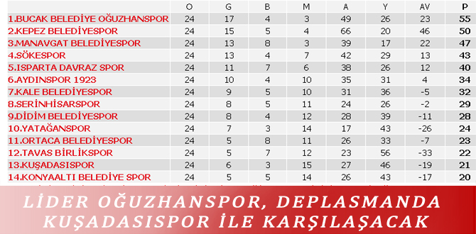 Bölgesel Amatör Lig 7. Grupta 25. hafta maçları 14 Nisan Pazar günü yarın oynanacak. Bucak Belediyesi Oğuzhanspor, bu hafta deplasmanda Kuşadasıspor ile karşılaşacak. Lig boyunca gösterdiği üstün perf...