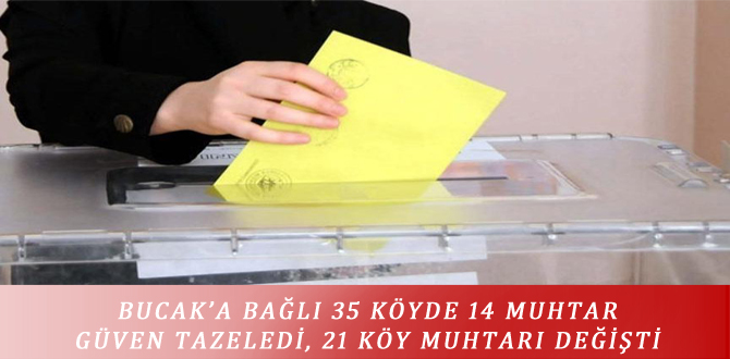 31 Mart Yerel seçimlerinde Burdur’un Bucak İlçesi’ne bağlı 35 köyde 14 muhtar güven tazeledi, 21 köy muhtarı değişti. Yerel seçimlerde Belediye Başkan adaylığı, Belediye Meclis Adaylığı ve İl Genel Me...