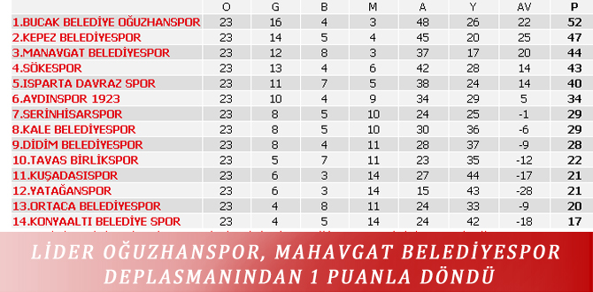 Bölgesel Amatör Lig 7. Grupta 23. hafta maçları Pazar günü oynandı. Bucak Belediyesi Oğuzhanspor, bu hafta deplasmanda Manavgat Belediyespor ile karşılaştı. Maç 0-0 beraberlikle sonuçlanırken, Lider O...