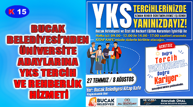 Bucak Belediyesinden ücretsiz üniversite danışmanlığı. Bucak Belediyesi üniversite adaylarını tercih sürecinde yalnız bırakmıyor. Bucak Belediyesinin kaymakamlık önündeki Kitap Kafede YKS tercih rehbe...