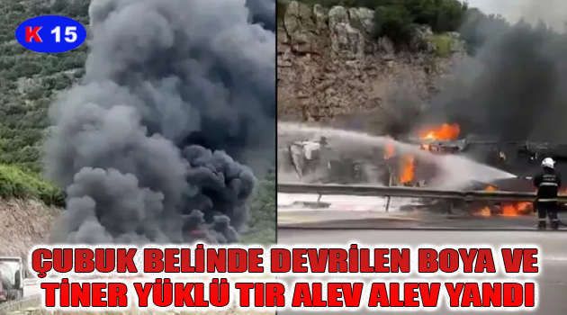 ÇUBUK BELİNDE DEVRİLEN BOYA VE TİNER YÜKLÜ TIR ALEV ALEV YANDI