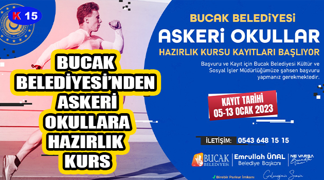 Bucak Belediyesi tarafından başlatılan çalışma ile askeri okullara Hazırlık Kursu’nun kayıtları, 5 Ocak Perşembe günü başlıyor. Bucak Belediyesi tarafından ücretsiz verilecek kurslarda gençler askeri...