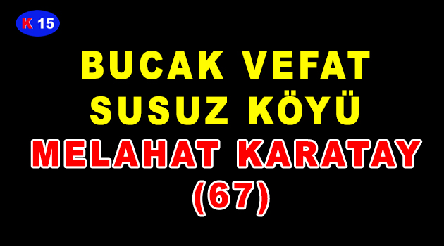 Susuz köyünden, Merhum Mustafa Apaydın kızı, Süleyman Karatay eşi, Melahat Karatay(67) vefat etmiştir. Cenaze namazı ikindi namazına müteakip Susuz köyünde kılınıp defnedilecektir Eşi Süleyman Karatay...