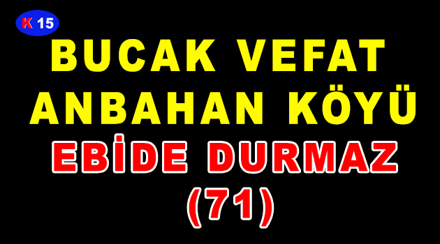 Anbahan köyünden, Veysel Durmaz eşi, Ebide Durmaz (71) vefat etmiştir. Cenaze namazı öğle namazına müteakip Anbahan köyünde kılınıp defnedilecektir. Oğlu Nazmi Durmaz +905326464188...