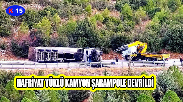 HAFRİYAT YÜKLÜ KAMYON ŞARAMPOLE DEVRİLDİ