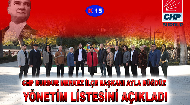 CHP Burdur Merkez ilçe Başkanı Ayla Büğdüz yönetim listesini açıkladı. CHP Burdur Merkez İlçe Başkanı Ayla Büğdüz, Beyaz liste ile yönetim kurulu listesi şu şekilde; Ayla Bügdüz, Akif Öz, Dudu Damla Ü...