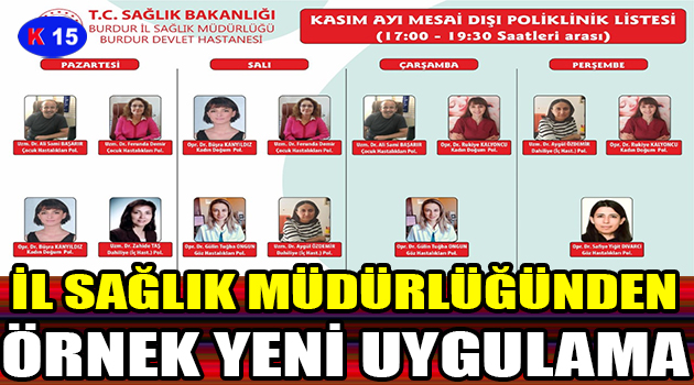 İL SAĞLIK MÜDÜRLÜĞÜNDEN ÖRNEK YENİ UYGULAMA BURDUR DEVLET HASTANELERİNDE “UZMAN HEKİMLER TARAFINDAN 17:00 – 19:00 ARASINDA MESAİ DIŞI POLİKLİNİK MUAYENE HİZMETİ”