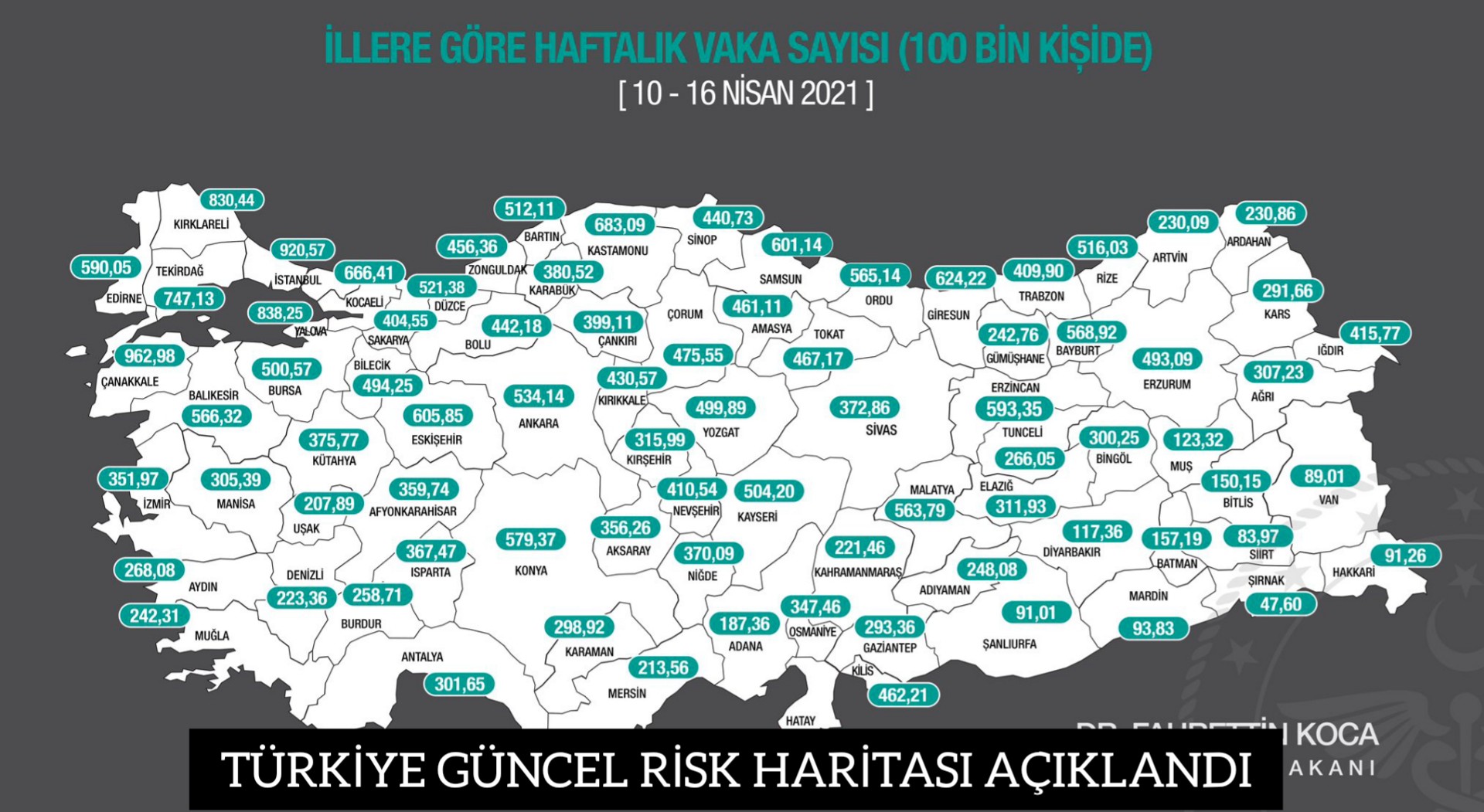 Sağlık Bakanı Fahrettin Koca her hafta illerde bir haftada 100.000 nüfusa karşılık gelen vaka sayısını gösteren risk haritasını güncel olarak paylaşıyor. Bu haftanınkini de paylaşan bakan koca ...