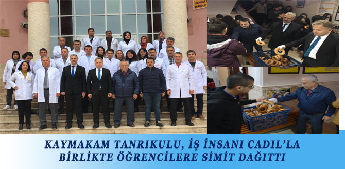 KAYMAKAM TANRIKULU, İŞ İNSANI CADIL’LA BİRLİKTE ÖĞRENCİLERE SİMİT DAĞITTI