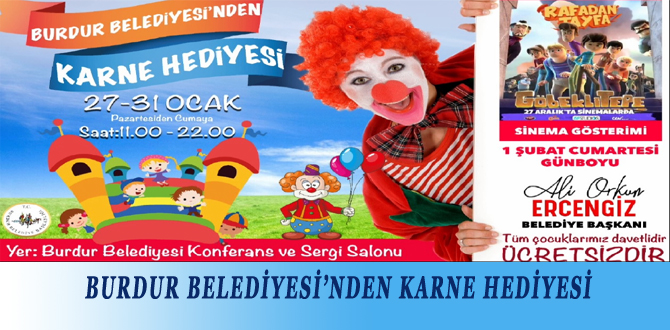 Burdur Belediye Başkanı Ali Orkun Ercengiz, yarıyıl tatili nedeniyle çocuklara karne hediyesi olarak eğlence parkı oluşturacak. Burdur Belediyesi tarafından düzenlenen Geleneksel Karne Hediyesi, bu yı...
