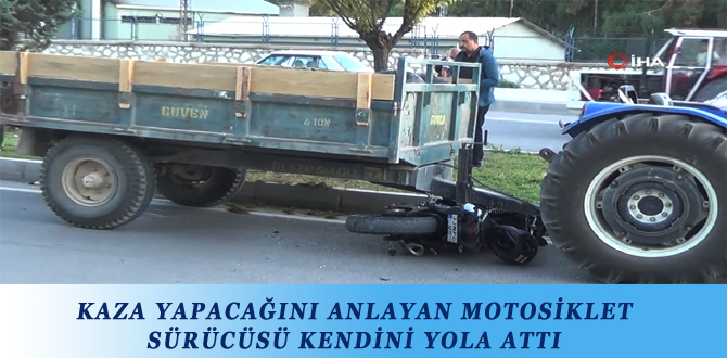 KAZA YAPACAĞINI ANLAYAN MOTOSİKLET SÜRÜCÜSÜ KENDİNİ YOLA ATTI