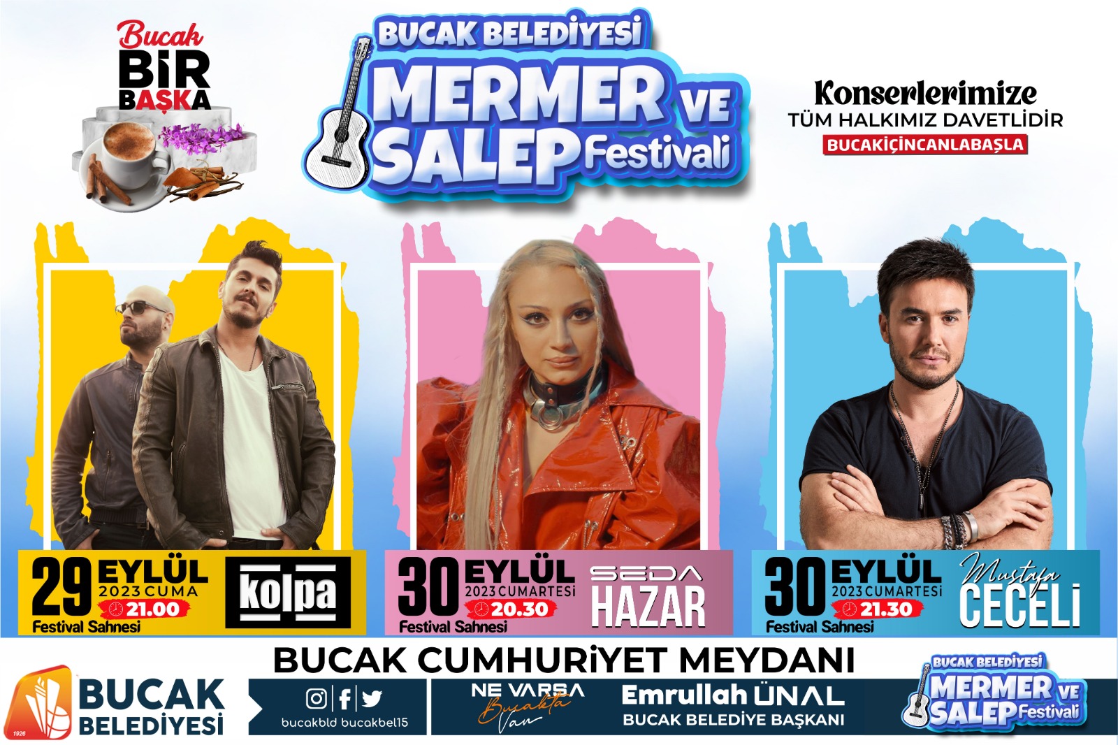 Bucak Belediyesi tarafından düzenlenen Mermer ve Salep Festivali kapsamında Türkiye’nin sevilen sanatçıları Mustafa Ceceli Seda Hazar ve Kolpa grubu Bucak’a geliyor. Kolpa 29 Eylül’de, Seda Hazar ve M...