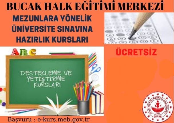 Bucak Halk Eğitimi Merkezi’nden mezunlara yönelik Destekleme ve Yetiştirme Kursları (üniversite sınavına hazırlık) açılması planlanmaktadır. Bucak Halk Eğitimi Merkezi Müdürlüğü tarafından yeter...