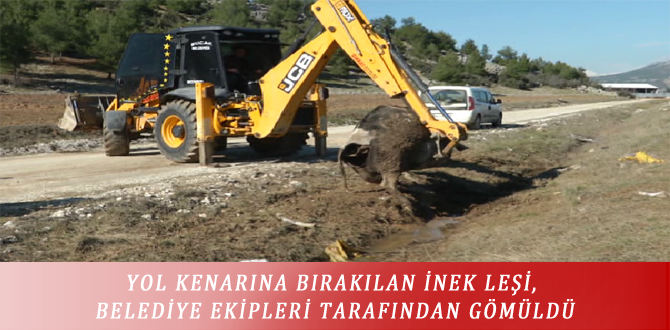 YOL KENARINA BIRAKILAN İNEK LEŞİ, BELEDİYE EKİPLERİ TARAFINDAN GÖMÜLDÜ