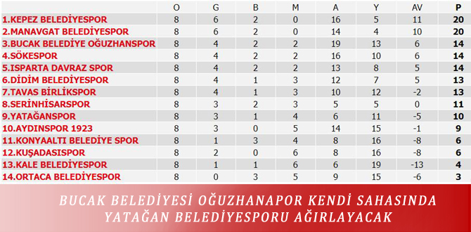 Bölgesel Amatör Lig 7. Grupta 9. Hafta maçları Pazar günü bugün oynanacak. Bucak Belediyesi Oğuzhanspor kendi sahasında Yatağan Belediyesporu ağırlayacak. Karşılaşma bugün saat 14.00’de Bucak İlçe Sta...