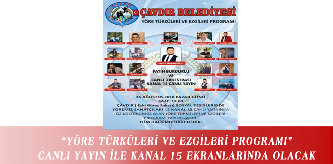 Burdur’un Çavdır ilçesinde bu hafta sonu Pazar günü “Yöre Türküleri ve Ezgileri Programı” düzenlenecek. Program Kanal 15 ekranlarından da canlı olarak ekranlara gelecek. Çavdır Belediyesi tarafından o...
