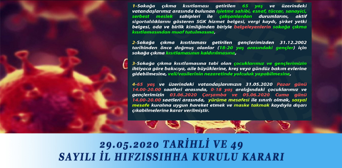 29.05.2020 TARİHLİ VE 49 SAYILI İL HIFZISSIHHA KURULU KARARI