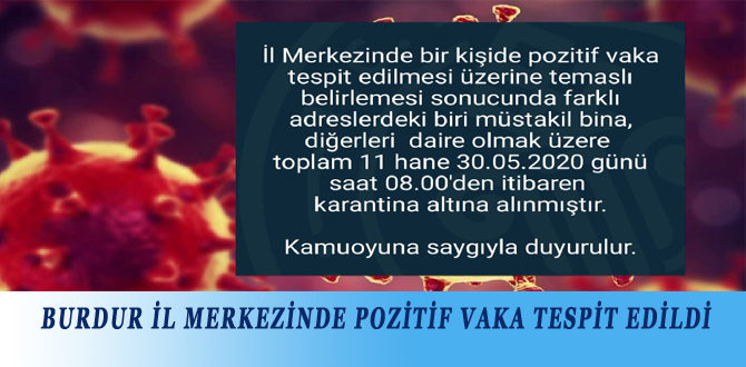 Burdur il merkezinde pozitif vaka tespit edildi. Burdur Valiliğinden yapılan açıklamada; “ İl Merkezinde bir kişide pozitif vaka tespit edilmesi üzerine temaslı belirlemesi sonucunda farklı adreslerde...