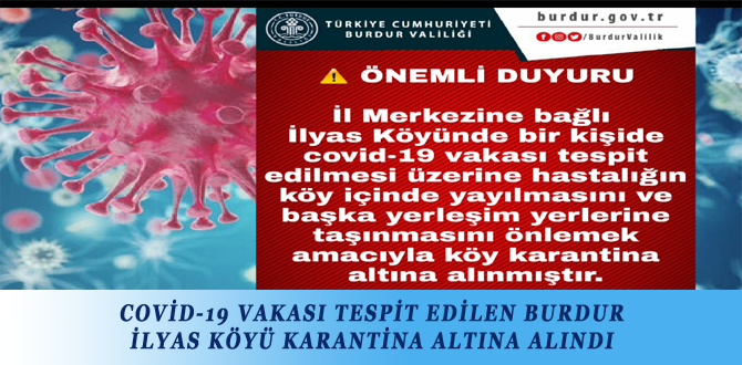 Burdur merkeze bağlı İlyas Köyünde bir kişide covid-19 vakası tespit edilmesi üzerine köy karantina altına alındı. Konuyla ilgili Burdur Valiliği tarafından yapılan açıklama şöyle; “İl Merkezine bağlı...