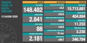 Sağlık Bakanı Fahrettin Koca 12 Kasım tarihli korona tablosunu kamuoyuyla paylaştı. Türkiye’de son 24 saatte 2.841 kişiye Covid-19 tanısı konuldu, 88 kişi hayatını kaybetti. Sağlık Bakanı Fahrettin Koca Koronavirüsün Türkiye’deki son durum bilgilerini günlük açıklıyor. Bakan Fahrettin Koca, 12 Kasım Perşembe gününe ilişkin son durum bilgilerini paylaştı. Sağlık Bakanı Fahrettin Koca rakam ve istatistiki verileri paylaştığı açıklamasında; “Türkiye Günlük Koronavirüs Tablosu güncel verilerine göre, bugün 148 bin 482 test yapıldı. 2.841 kişiye Covid-19 tanısı konuldu. Son 24 saatte 88 hasta vefat etti, 2.181 hasta iyileşti. Toplam test sayısı 15.713.891, toplam vaka sayısı 404 bin 894, toplam vefat sayısı 11 bin 233 oldu. Hastalarda zatürre oranı %4.2, ağır hasta sayısı 3.230, iyileşen toplam hasta sayısı 346 bin 794 olarak kayıtlara geçti” dedi. Bakan Fahrettin Koca, sosyal medya hesabından yaptığı paylaşımda; “Bugün tespit edilen 2.841 yeni hastamız var. Ağır hasta sayısındaki artış devam ediyor. Artan hasta sayısını düşürecek olan hareketliliği ve teması azaltarak tedbirlere beraberce uymaktır. Maske ile virüs yükünü düşürelim” değerlendirmesinde bulundu.