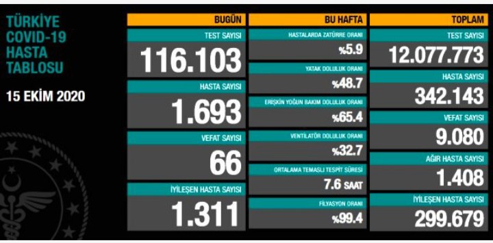 Sağlık Bakanı Fahrettin Koca 15 Ekim tarihli korona tablosunu kamuoyuyla paylaştı. Türkiye’de son 24 saatte 1.693 kişiye Covid-19 tanısı konuldu, 66 kişi hayatını kaybetti. Sağlık Bakanı Fahrettin Koca Koronavirüsün Türkiye’deki son durum bilgilerini günlük açıklıyor. Bakan Fahrettin Koca, 15 Ekim Perşembe gününe ilişkin son durum bilgilerini paylaştı. Bakan Koca, Türkiye’de son 24 saatte 1.693 kişiye Covid-19 tanısı konulduğunu, 66 kişinin hayatını kaybettiğini açıkladı. Sağlık Bakanı Fahrettin Koca rakam ve istatistiki verileri paylaştığı açıklamasında; “Türkiye Günlük Koronavirüs Tablosu güncel verilerine göre, bugün 116 bin 103 test yapıldı. 1.693 kişiye Covid-19 tanısı konuldu. Son 24 saatte 66 hasta vefat etti, 1.311 hasta iyileşti. Toplam test sayısı 12.077.773, toplam vaka sayısı 342 bin 143, toplam vefat sayısı 9 bin 080 oldu. Hastalarda zatürre oranı %5.9, ağır hasta sayısı 1.408, iyileşen toplam hasta sayısı 299 bin 679 olarak kayıtlara geçti” dedi. Bakan Fahrettin Koca, sosyal medya hesabından yaptığı paylaşımda; “Toplamda 12 milyondan fazla test yapıldı. Bugün tespit edilen 1.693 yeni hasta var. Ağır hasta sayımız durağan seyrine devam ediyor. Filyasyon, izolasyon eksiksiz devam ediyor. Hasta sayısını tedbirlere birlikte uyarak azaltabiliriz. Kazanan biz olacağız” değerlendirmesinde bulundu.