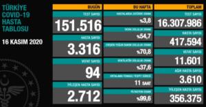 Sağlık Bakanı Fahrettin Koca 16 Kasım tarihli korona tablosunu kamuoyuyla paylaştı. Türkiye’de son 24 saatte 3.316 kişiye Covid-19 tanısı konuldu, 94 kişi hayatını kaybetti. Sağlık Bakanı Fahrettin Koca Koronavirüsün Türkiye’deki son durum bilgilerini günlük açıklıyor. Bakan Fahrettin Koca, 16 Kasım Pazartesi gününe ilişkin son durum bilgilerini paylaştı. Sağlık Bakanı Fahrettin Koca rakam ve istatistiki verileri paylaştığı açıklamasında; “Türkiye Günlük Koronavirüs Tablosu güncel verilerine göre, bugün 151 bin 516 test yapıldı. 3.316 kişiye Covid-19 tanısı konuldu. Son 24 saatte 94 hasta vefat etti, 2.712 hasta iyileşti. Toplam test sayısı 16.307.986, toplam vaka sayısı 417 bin 594, toplam vefat sayısı 11 bin 601 oldu. Hastalarda zatürre oranı %3.8, ağır hasta sayısı 3.610, iyileşen toplam hasta sayısı 356 bin 375 olarak kayıtlara geçti” dedi. Bakan Fahrettin Koca, sosyal medya hesabından yaptığı paylaşımda; “Bugün tespit edilen 3.316 yeni hastamız var. Ağır hasta sayımız 3.610’a yükseldi. Tedbirlere uymak, birlikte hareket etmek bu mücadelenin en önemli silahıdır. Tedbirlere uyma sorumluluğu hepimize ait. Tedbirlere birlikte uyarak mücadeleye güç verin” değerlendirmesinde bulundu.