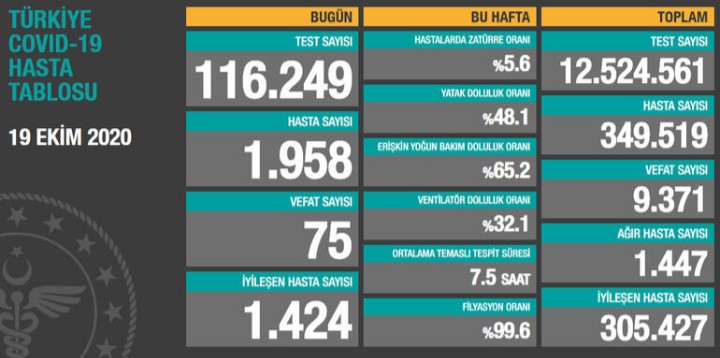 Sağlık Bakanı Fahrettin Koca 19 Ekim tarihli korona tablosunu kamuoyuyla paylaştı. Türkiye’de son 24 saatte 1.958 kişiye Covid-19 tanısı konuldu, 75 kişi hayatını kaybetti. Sağlık Bakanı Fahrettin Koca Koronavirüsün Türkiye’deki son durum bilgilerini günlük açıklıyor. Bakan Fahrettin Koca, 19 Ekim Pazartesi gününe ilişkin son durum bilgilerini paylaştı. Bakan Koca, Türkiye’de son 24 saatte 1.958 kişiye Covid-19 tanısı konulduğunu, 75 kişinin hayatını kaybettiğini açıkladı. Sağlık Bakanı Fahrettin Koca rakam ve istatistiki verileri paylaştığı açıklamasında; “Türkiye Günlük Koronavirüs Tablosu güncel verilerine göre, bugün 116 bin 249 test yapıldı. 1.958 kişiye Covid-19 tanısı konuldu. Son 24 saatte 75 hasta vefat etti, 1.424 hasta iyileşti. Toplam test sayısı 12.524.561, toplam vaka sayısı 349 bin 519, toplam vefat sayısı 9 bin 371 oldu. Hastalarda zatürre oranı %5.6, ağır hasta sayısı 1.447, iyileşen toplam hasta sayısı 305 bin 427 olarak kayıtlara geçti” dedi. Bakan Fahrettin Koca, sosyal medya hesabından yaptığı paylaşımda; “Bugün tespit edilen 1.958 yeni hastamız var. Ağır hasta sayısını azaltmadan mücadelemizi başarıya ulaştırmamız güç. Bunu ancak tedbirlere birlikte uyarak güç birliği ile sağlayabiliriz. Sağlık çalışanlarımızın emeklerini katkı vererek yüceltelim” değerlendirmesinde bulundu.