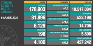 Sağlık Bakanı Fahrettin Koca 5 Aralık tarihli korona tablosunu kamuoyuyla paylaştı. Türkiye’de son 24 saatte 6.128 kişiye Covid-19 tanısı konuldu, 196 kişi hayatını kaybetti. Sağlık Bakanı Fahrettin Koca Koronavirüsün Türkiye’deki son durum bilgilerini günlük açıklıyor. Bakan Fahrettin Koca, 5 Aralık Cumartesi gününe ilişkin son durum bilgilerini paylaştı. Sağlık Bakanı Fahrettin Koca rakam ve istatistiki verileri paylaştığı açıklamasında; “Türkiye Günlük Koronavirüs Tablosu güncel verilerine göre, bugün 178 bin 903 test yapıldı. 31.896 pozitif vaka 6.128 kişi de hastane de tedavi görüyor. Son 24 saatte 196 hasta vefat etti, 4.100 hasta iyileşti. Toplam test sayısı 19.517.084, toplam vaka sayısı 533 bin 198, toplam vefat sayısı 14 bin 705 oldu. Hastalarda zatürre oranı %3.3, ağır hasta sayısı 5.800, iyileşen toplam hasta sayısı 427 bin 242 olarak kayıtlara geçti” dedi. Bakan Fahrettin Koca, sosyal medya hesabından yaptığı paylaşımda; “Bugün tespit edilen 6.128 hastamız var. Sokağa çıkma kısıtlamalarının tek sebebi toplum sağlığını korumaktır. Hepimiz üzerimize düşeni yapmalı ve kendi kısıtlamalarımızı uygulamalıyız. Evimiz en güvenli yerdir. Kapalı ve kalabalık ortamlara ara verelim” değerlendirmesinde bulundu.