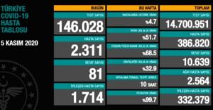 Sağlık Bakanı Fahrettin Koca 5 Kasım tarihli korona tablosunu kamuoyuyla paylaştı. Türkiye’de son 24 saatte 2.311 kişiye Covid-19 tanısı konuldu, 81 kişi hayatını kaybetti. Sağlık Bakanı Fahrettin Koca Koronavirüsün Türkiye’deki son durum bilgilerini günlük açıklıyor. Bakan Fahrettin Koca, 5 Kasım Perşembe gününe ilişkin son durum bilgilerini paylaştı. Sağlık Bakanı Fahrettin Koca rakam ve istatistiki verileri paylaştığı açıklamasında; “Türkiye Günlük Koronavirüs Tablosu güncel verilerine göre, bugün 146 bin 028 test yapıldı. 2.311 kişiye Covid-19 tanısı konuldu. Son 24 saatte 81 hasta vefat etti, 1.714 hasta iyileşti. Toplam test sayısı 14.700.951, toplam vaka sayısı 386 bin 820, toplam vefat sayısı 10 bin 639 oldu. Hastalarda zatürre oranı %4.7, ağır hasta sayısı 2.564, iyileşen toplam hasta sayısı 332 bin 379 olarak kayıtlara geçti” dedi. Bakan Fahrettin Koca, sosyal medya hesabından yaptığı paylaşımda; “Bugün tespit edilen 2.311 yeni hastamız var. Ağır hasta sayımız dünden 100 fazla. Bu artışa engel olmak zorundayız. Hastalığa yakalanmayı göze alacak kadar mecbur olmadıkça temas ve hareketlilikten uzak durun. Hijyene önem verin. Maske kullanın” değerlendirmesinde bulundu.