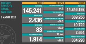 Sağlık Bakanı Fahrettin Koca 6 Kasım tarihli korona tablosunu kamuoyuyla paylaştı. Türkiye’de son 24 saatte 2.436 kişiye Covid-19 tanısı konuldu, 83 kişi hayatını kaybetti. Sağlık Bakanı Fahrettin Koca Koronavirüsün Türkiye’deki son durum bilgilerini günlük açıklıyor. Bakan Fahrettin Koca, 6 Kasım Cuma gününe ilişkin son durum bilgilerini paylaştı. Sağlık Bakanı Fahrettin Koca rakam ve istatistiki verileri paylaştığı açıklamasında; “Türkiye Günlük Koronavirüs Tablosu güncel verilerine göre, bugün 145 bin 241 test yapıldı. 2.436 kişiye Covid-19 tanısı konuldu. Son 24 saatte 83 hasta vefat etti, 1.914 hasta iyileşti. Toplam test sayısı 14.846.192, toplam vaka sayısı 389 bin 256, toplam vefat sayısı 10 bin 722 oldu. Hastalarda zatürre oranı %4.7, ağır hasta sayısı 2.654, iyileşen toplam hasta sayısı 334 bin 293 olarak kayıtlara geçti” dedi. Bakan Fahrettin Koca, sosyal medya hesabından yaptığı paylaşımda; “Bugün tespit edilen 2.436 hastamız var. Ağır hasta sayımız artıyor. Sağlık hizmetinde bir güçlük yaşamamak için sağlık çalışanlarımıza dinlenecek zaman tanımalıyız. Bu ancak tedbirlere birlikte uymakla mümkün. Maske takın. Mesafenizi koruyun” değerlendirmesinde bulundu.