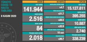 Sağlık Bakanı Fahrettin Koca 8 Kasım tarihli korona tablosunu kamuoyuyla paylaştı. Türkiye’de son 24 saatte 2.516 kişiye Covid-19 tanısı konuldu, 84 kişi hayatını kaybetti. Sağlık Bakanı Fahrettin Koca Koronavirüsün Türkiye’deki son durum bilgilerini günlük açıklıyor. Bakan Fahrettin Koca, 8 Kasım Pazar gününe ilişkin son durum bilgilerini paylaştı. Sağlık Bakanı Fahrettin Koca rakam ve istatistiki verileri paylaştığı açıklamasında; “Türkiye Günlük Koronavirüs Tablosu güncel verilerine göre, bugün 141 bin 944 test yapıldı. 2.516 kişiye Covid-19 tanısı konuldu. Son 24 saatte 84 hasta vefat etti, 2.018 hasta iyileşti. Toplam test sayısı 15.127.811, toplam vaka sayısı 395 bin 255, toplam vefat sayısı 10 bin 887 oldu. Hastalarda zatürre oranı %4.7, ağır hasta sayısı 2.740, iyileşen toplam hasta sayısı 338 bin 239 olarak kayıtlara geçti” dedi. Bakan Fahrettin Koca, sosyal medya hesabından yaptığı paylaşımda; “Bugün tespit edilen 2.516 yeni hastamız var. Ağır hasta sayımız 2.740’a ulaştı. Bugün taburcu olan 2.000’den fazla iyileşen hastamız oldu. Zorunlu olmadıkça kalabalık ortamlardan uzak durun. Hijyene dikkat edin. Maske kullanın” değerlendirmesinde bulundu.