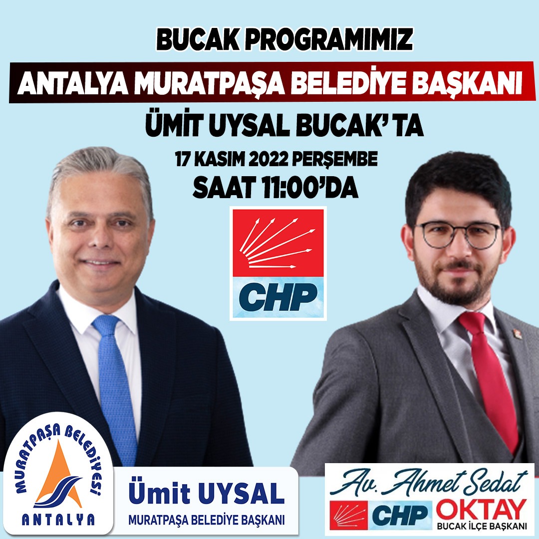 Başkan Ümit Uysal 17 Kasım 2022 Perşembe günü saat 11:00’da Bucak’a gelecek. Başkan Uysal Bucak’ta vatandaşlarla, esnaflarla ve partililerle buluşacak.