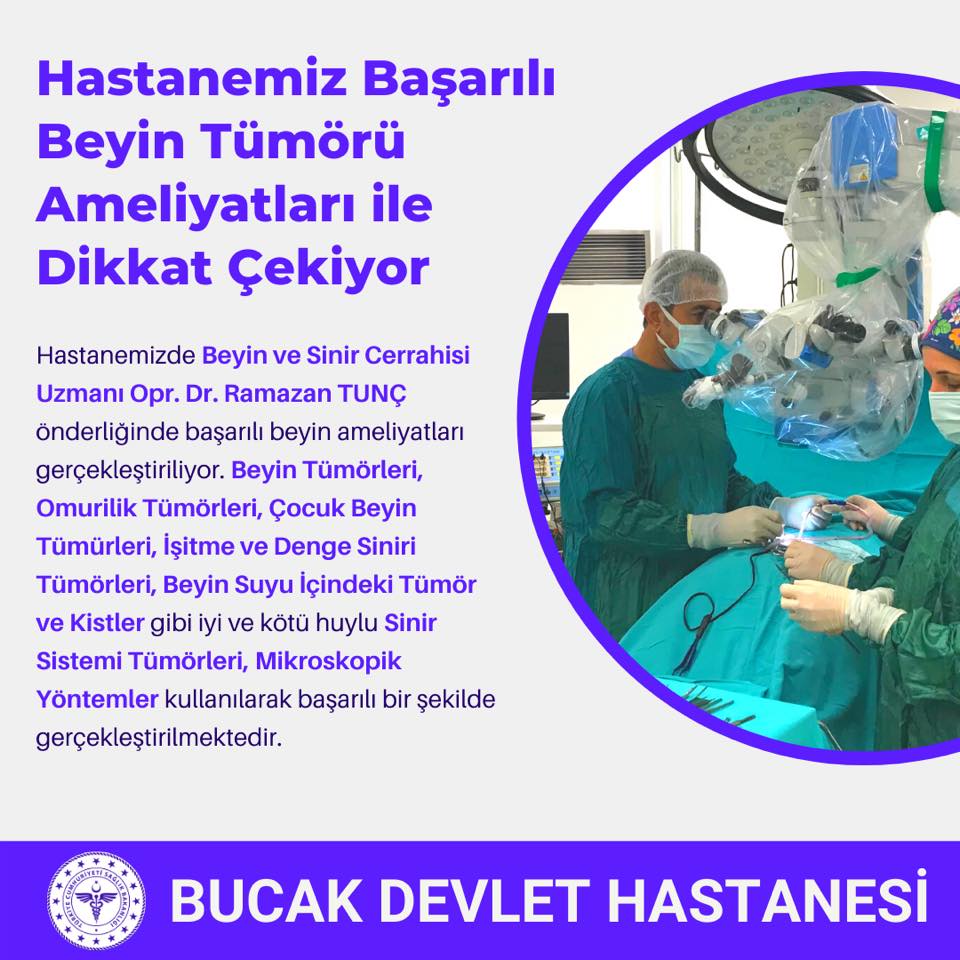 Bucak Devlet Hastanesinde Beyin ve Sinir Cerrahisi Uzmanı Opr. Dr. Ramazan Tunç önderliğinde başarılı Beyin Ameliyatları gerçekleştiriliyor. Beyin Tümörleri, Omurilik Tümörleri, Çocuk Beyin Tümörleri, İşitme ve Denge Siniri Tümörleri, Beyin suyu İçindeki Tümör ve Kistler gibi iyi ve kötü huylu Sinir Sistemi Tümörleri Mikroskopik Yöntemler kullanılarak başarılı bir şekilde gerçekleştirilmekte. Hastanedeki Beyin ve Sinir Cerrahisi Tümör Ameliyatları ile ilgili konuşan Başhekim Uzm. Dr. Bilal Tanrıtanır bu ameliyatlarının Bucak Devlet Hastanesi’nde gerçekleşmesinin öneminin altını çizerek ”Beyin ve Sinir Cerrahisi Uzmanımız Opr. Dr. Ramazan Tunç hocamız ile, hastanemizde daha önce gerçekleştirilmeyen Beyin ve Sinir Cerrahisi Tümör Ameliyatları artık başarı ile gerçekleştirilmekte. Böylelikle Bucak Devlet Hastanesi olarak İlçemize ve Bölgemize sunduğumuz Nitelikli Sağlık Hizmetleri’ne bir yenisi daha eklenmiş oldu. Bucak Devlet Hastanesi olarak hekim kadromuzu güçlendirerek vatandaşlarımıza en iyi sağlık hizmetini sunmaya devam edeceğiz. Bu vesile ile hocamızı başarılı ameliyatları için tebrik ediyor, hastalarımıza acil şifalar diliyoruz” ifadelerini kullandı.