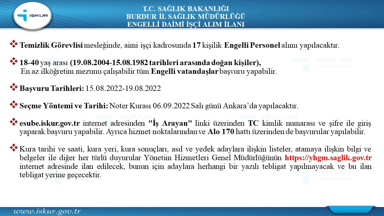 Burdur İşkur Müdürlüğü tarafından sosyal medya üzerinden yapılan paylaşımda; “Burdur İl Sağlık Müdürlüğü bünyesinde çalıştırılmak üzere temizlik görevlisi mesleğinde, daimi işçi statüsünde 17 Engelli Personel alımı yapılacaktır.” İfadelerine yer verildi.