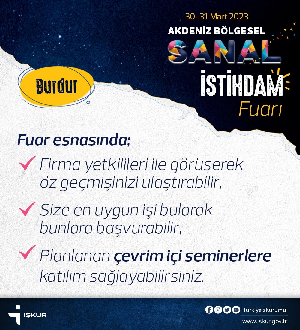 Online olarak iş arayan ve işverenleri buluşturmak, depremzede vatandaşların hızla işgücü piyasasına yeniden girişlerini desteklemek için İşkurun kendi platformu aracılığı ile 30-31 Mart 2023 tarihinde Akdeniz Bölgesi (Adana, Isparta, Antalya, Burdur, Mersin) Sanal İstihdam Fuarı düzenlenecek.