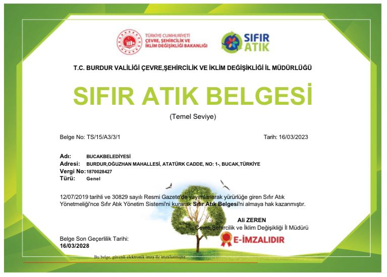 Burdur’da Sıfır Atık Genel Belgesini Almaya Hak Kazanan İlk Belediye Bucak Belediyesi oldu. Bucak Belediyesine 30 Mart Sıfır atık gününde Sıfır Atık Genel Belgesi verildi. Sıfır Atık Genel Belgesini, Burdur Çevre Şehircilik ve İklim Değişikliği İl Müdürü Ali ZEREN, Belediye Başkanı Emrullah ÜNAL’a makamında verdi.