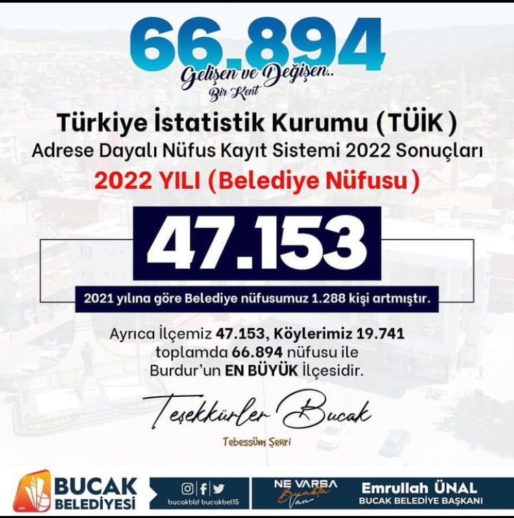Türkiye İstatistik Kurumunun Adrese Dayalı Nüfus Kayıt Sistemi 2022 Sonuçlarına göre Burdur’un Bucak İlçesinin nüfusu 2021 yılına göre artış gösterdi. Burdur’un en büyük ilçesi olan Bucak Merkezde Nüfus 47.153 olurken Köylerle birlikte nüfus 66.894’e yükseldi. Konuyla ilgili sosyal medya hesabından paylaşımda Bulunan Bucak Belediye Başkanı Emrullah Ünal; “Türkiye İstatistik Kurumunun Adrese Dayalı Nüfus Kayıt Sistemi 2022 Sonuçlarına göre İlçemizin (Belediye) nüfusu 2021 yılına göre 1.288 kişi artarak 47.153 olmuştur. Bununla birlikte İlçemiz 66.894 nüfusu ile Burdur’un EN BÜYÜK İlçesidir. Bucak’ımız her geçen gün büyümeye ve gelişmeye devam ediyor. #TeşekkürlerBucak” dedi.
