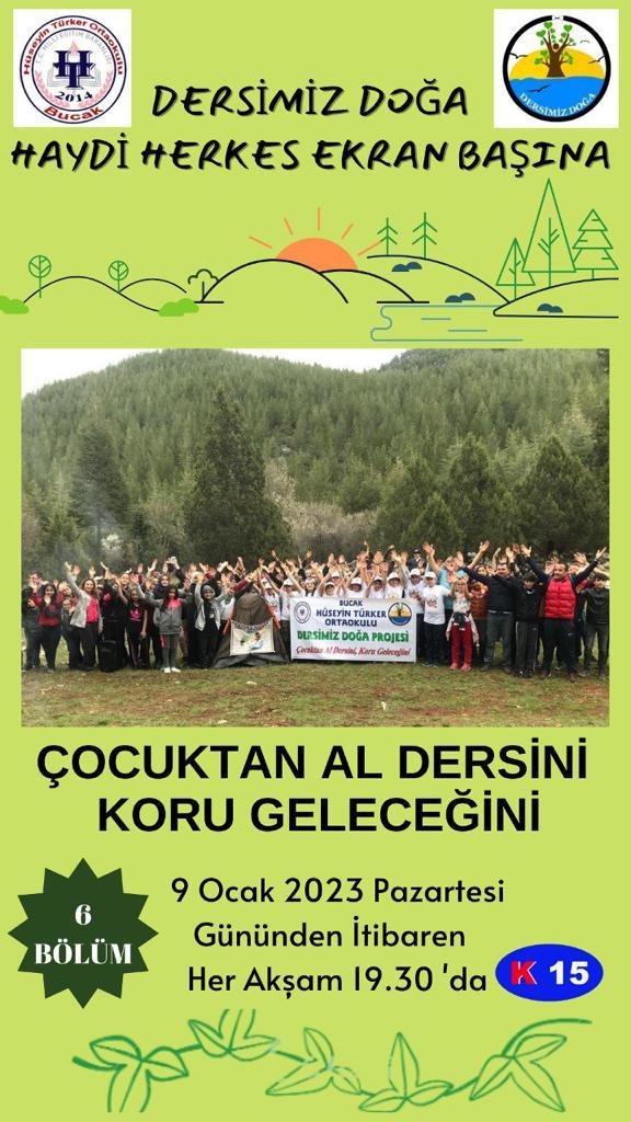 “Dersimiz Doğa” Projesi kapsamında doğanın tanınması, doğa sevgisi kazanılması ve bilinçli nesillerin yetiştirilmesini hedefleyen Bucak Hüseyin Türker Ortaokulu öğrenciler tarafından hazırlanan eğitici videolar, 9 Ocak Pazartesi’den itibaren her akşam saat 19.30’da Kanal 15 Televizyonu aracılığı ile izleyiciye ulaşacak. Okul yönetimi ve proje ekibi, Kanal 15’in katkılarıyla hazırlanan ve Kanal 15 Televizyonunda yayınlanacak olan eğitici videoları izlemek üzere doğa ve gelecek için 9 Ocak Pazartesi ve takip eden günlerde saat 19.30’da herkesi ekranları başına davet etti.