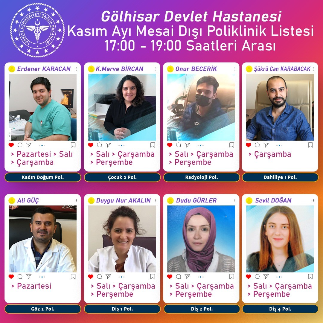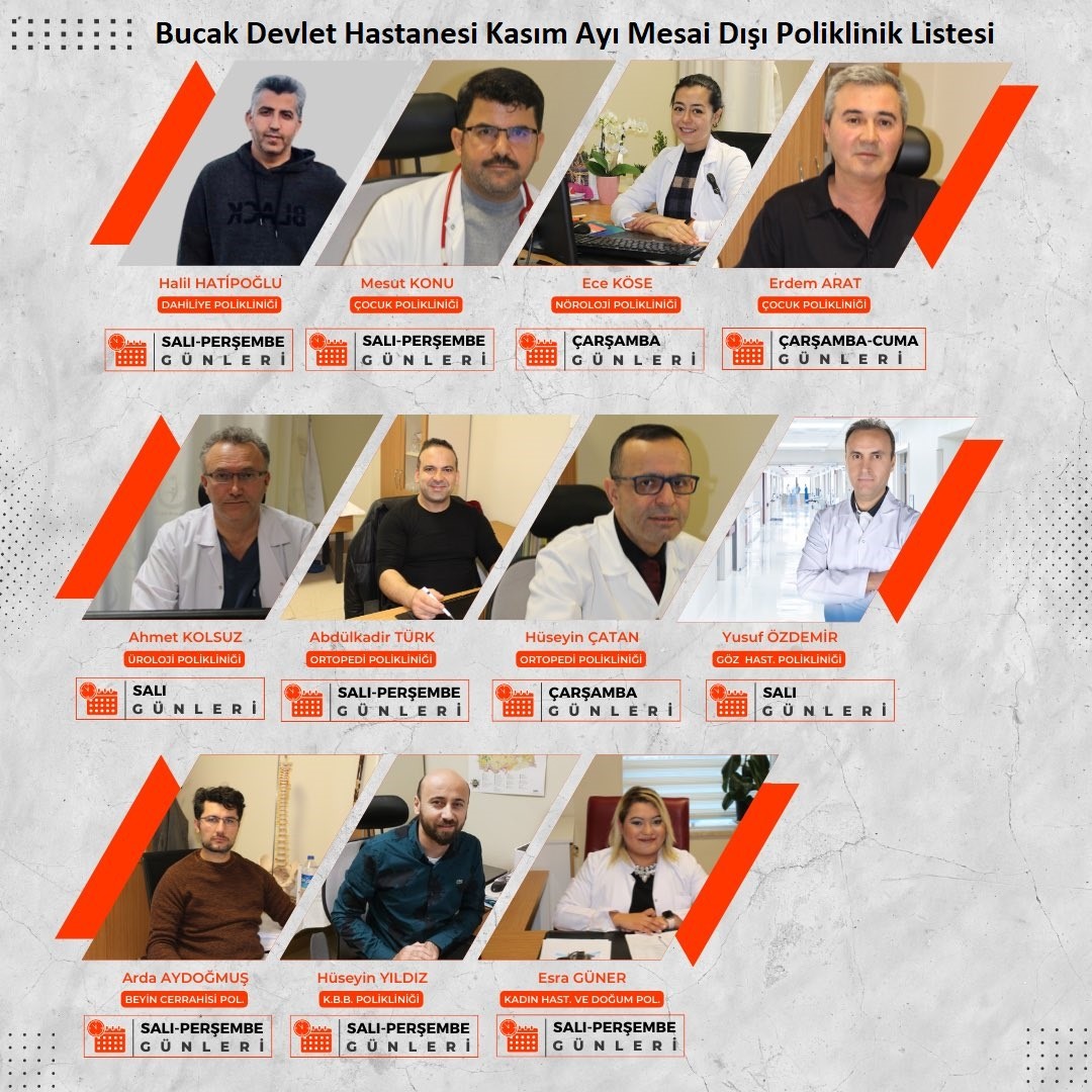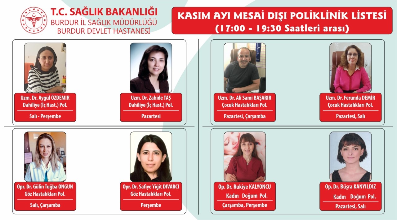 Bu kapsamda İl Sağlık Müdürlüğüne bağlı Burdur Devlet Hastanesi, Bucak Devlet Hastanesi ve Gölhisar Devlet Hastanelerinde Kasım ayı itibariyle saat 17:00 – 19:00 arasında Uzman Hekimler tarafından mesai dışı poliklinik muayene hizmeti uygulamasına başlanması planlandı.