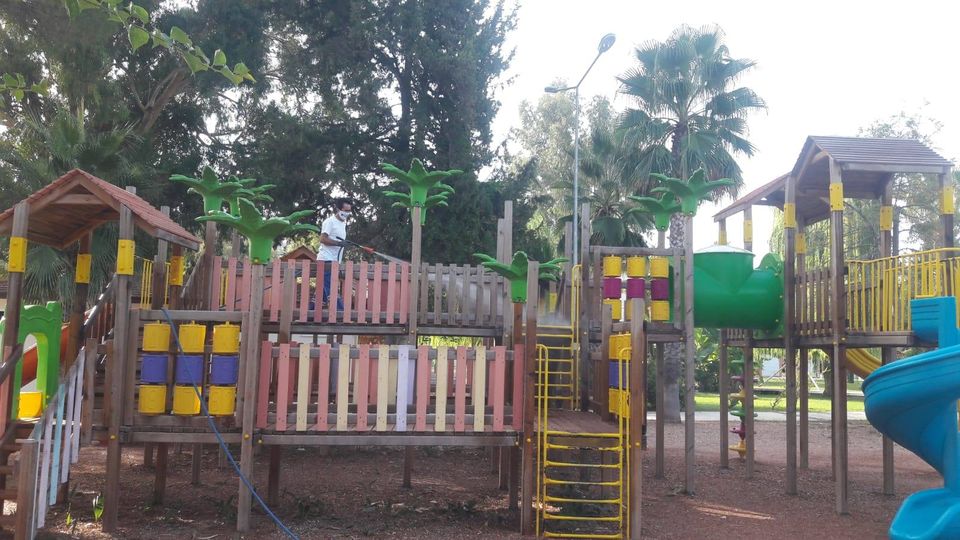 Koronavirüse karşı alınan tedbirler kapsamında dezenfekte ekipleri, otobüs durakları, çocuk oyun alanları ve spor aletleri, kamu kurumlarının rutin dezenfekte işlerini aralıksız yapmaya devam ediyor.