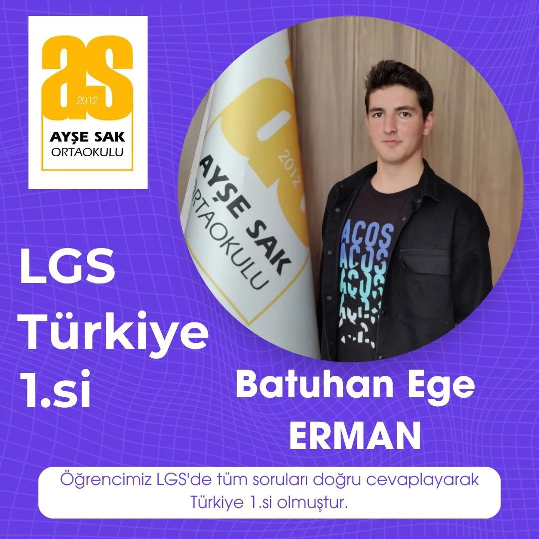 Batuhan Ege Erman’a sonraki Eğitim-Öğretim hayatında başarılar dileyen Ayşe Sak Ortaokulu okul yönetimi tarafından yapılan açıklamada; “2023 yılı sınavla öğrenci alan ortaöğretim kurumlarına ilişkin Merkezi Sınav’da tüm soruları doğru cevaplayarak 500 tam puan alan öğrencimiz Batuhan Ege Erman’ı ve bu başarıda en büyük destekçisi olan Erman ailesini tebrik ediyoruz. Emeği geçen tüm öğretmenlerimize de Ayşe Sak Ortaokulu ailesi olarak teşekkür ederiz. Gurur duyduk. Yolun açık, başarıların daim olsun Batuhan. Tüm öğrencilerimize de yeni eğitim-öğretim hayatlarında başarılar dileriz” denildi.
