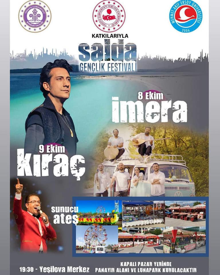 Festivale gelenlere Salda Gölü tanıtım gezileri düzenleyecekleri bir ekip oluşturduklarını da belirten Kaymakam Yenisoy “Bu kadar basında çıkan haberlere insanların tanıklık etmesi daha etkileyici olacaktır. Herkesi bekliyoruz” dedi. Burdur Valiliği, Yeşilova Kaymakamlığı ve Mehmet Akif Ersoy Üniversitesi’nin katkıları ile düzenlenecek festival kapsamında 8 Ekim Cumartesi günü Yeşilova ilçe merkezinde düzenlenecek etkinlikte İmera grubu, son gün ise sanatçı Kıraç sahneye çıkacak.
