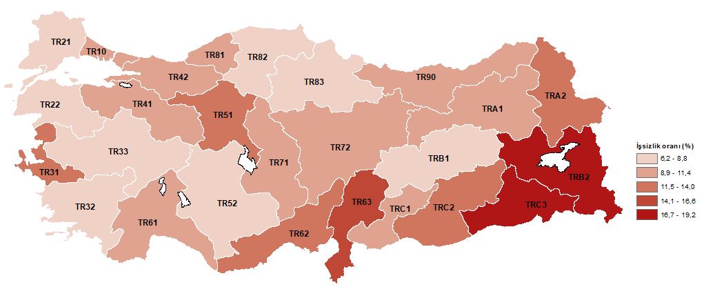 İşsizlik oranı en yüksek bölge %19,2 ile TRB2 (Van, Muş, Bitlis, Hakkari) iken, işsizlik oranı en düşük bölge %6,2 ile TR82 (Kastamonu, Çankırı, Sinop) oldu.
