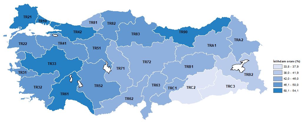 En yüksek istihdam oranı %54,1 ile TR21 (Tekirdağ, Edirne, Kırklareli) Bölgesi’nde gerçekleşti. En düşük istihdam oranı ise %33,8 ile TRC3 (Mardin, Batman, Şırnak, Siirt) bölgesinde oldu.