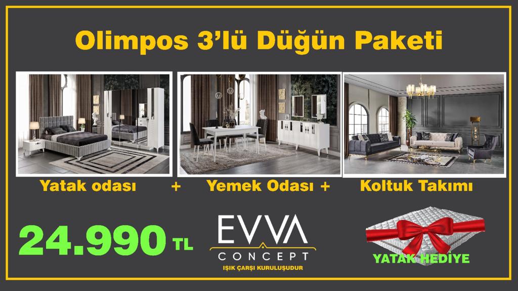 IŞIK ÇARŞI-EVVA CONSEPT’TE YATAK ODASI,YEMEK ODASI,KOLTUK TAKIMINDAN OLUŞAN OLİMPOS 3’LÜ DÜĞÜN PAKETİ SADECE
